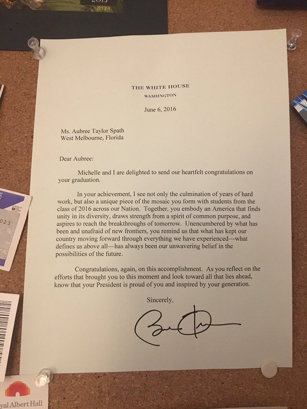 Không chỉ là thiệp mời cưới, cô gái có tên Aubree Spath cho biết sau khi gửi cho ông Obama thông báo tốt nghiệp phổ thông của mình, cô đã vô cùng cảm động vì nhận được lá thư động viên, chúc mừng từ ông.