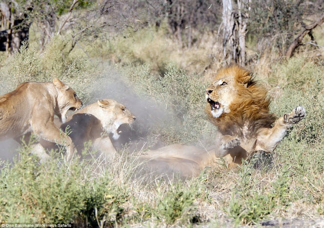 Con sư tử đực bị các thành viên trong đàn tấn công ngã xuống đất, buộc phải bỏ chạy để bảo toàn tính mạng. “Những con cái hài lòng với hình phạt của chúng dành cho kẻ vô tổ chức”, Basimane nói.
