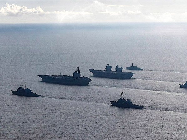 Từ trái qua: Tàu tuần dương Mỹ USS Philippine Sea, hàng không mẫu hạm USS George H.W. Bush, tàu Anh HMS Queen Elizabeth và tàu khu trục Anh HMS Westminster. (Ảnh: HMS Queen Elizabeth/Twitter)