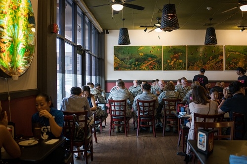 Lính Mỹ trong một quán cà phê ở đảo Guam hồi đầu tuần. Ảnh: Nancy Browick.
