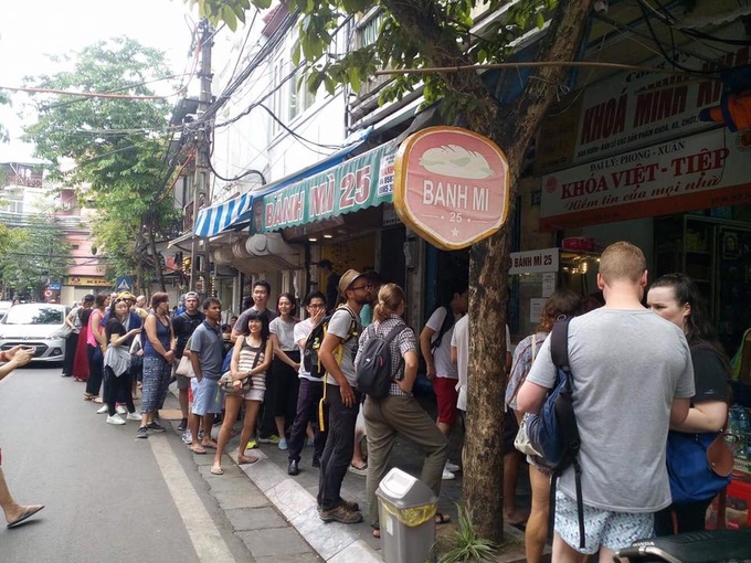 Nếu t́m từ khóa bánh ḿ Hà Nội trên TripAdvisor th́ cái tên xuất hiện đầu tiên là Bánh ḿ 25. Điều đó lư giải cho những lượt khách xếp hàng dài trước quầy để được thưởng thức. Quán nằm trên đường Hàng Cá, được nhiều người đánh giá là phục vụ bánh ḿ gịn, patê ngon. Giá 25.000 đồng một chiếc, đầy đặn, gói sạch sẽ, miễn phí trà và chuối.
