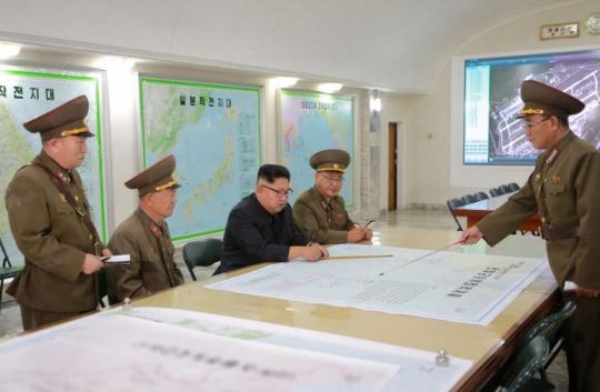 Nhà lănh đạo Kim Jong-un nghe các tướng lĩnh tŕnh bày về kế hoạch tấn công Guam. Ảnh: KCNA