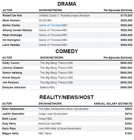 Không những choáng ngợp với cát-xê của các series chính kịch, khán giả còn sốc hơn khi biết rằng dàn diễn viên của series hài The Big Bang Theory nhận tới 900 nghìn USD cho một tập phim của đài CBS. "The Rock" Dwayne Johnsson cũng góp mặt trong bảng này với 650 nghìn USD cho mỗi tập phim Ballers - bộ phim về các vận động viên bóng bầu dục.