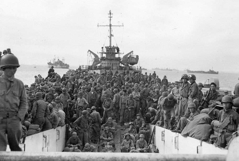 Lực lượng Bộ binh Mỹ thuộc Trung Đoàn bộ binh 31 chuẩn bị đổ bộ xuống cảng Incheon vào ngày 18.9.1950