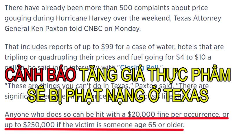 Cảnh báo đến các cửa hàng buôn bán thực phẩm ở Texas cần biết điều này. Trong khi người dân đang phải trải qua trận siêu bão khủng khiếp gây thiệt hại vô cùng lớn. Nếu các cửa hàng buôn bán thực phẩm tranh thủ thời gian này để tăng giá sản phẩm sẽ phải chiu phạt rất nặng.