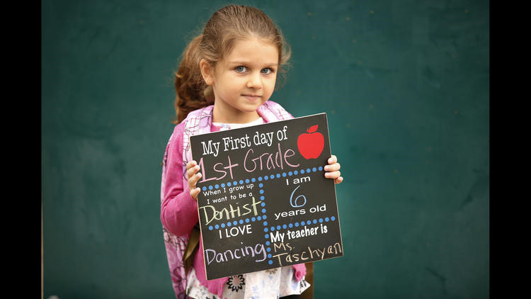 Armineh Balian (phải) chụp ảnh kỷ niệm cho con gái Emily trong ngày đầu tiên bé đến lớp tại trường Tiểu học Mountain View ở vùng Tujunga (Mỹ).