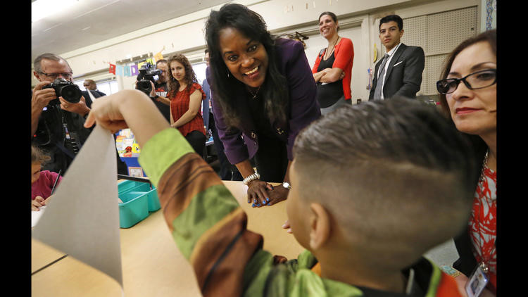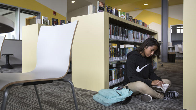 Angela Diaz lướt qua một cuốn sách trong thư viện của trường trong ngày khai giảng.