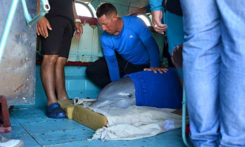 Cá heo được quấn khăn ướt và chở bằng trực thăng