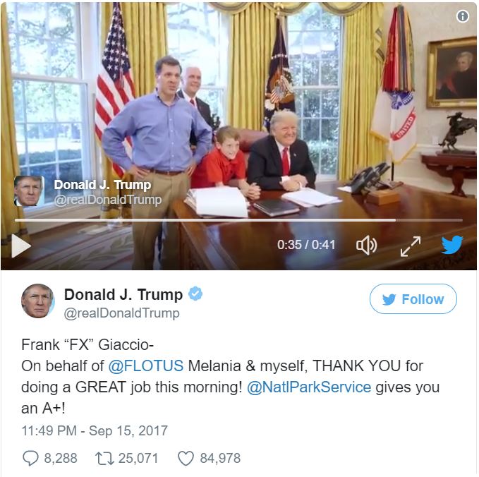 Sau khi nhận được "đơn xin việc" đáng yêu của cậu bé, Nhà Trắng đồng ý nhận cậu vào làm. Frank làm việc rất nghiêm túc và không hề xao nhãng dù chỉ một giây. Vì đeo thiết bị bảo vệ tai nên cậu bé không hề biết khi tổng thống đến chỗ mình cho đến khỉ người quản lý đến nhắc. Ông Trump khen Frank làm việc rất tốt và còn đập tay với nhân viên nhí.