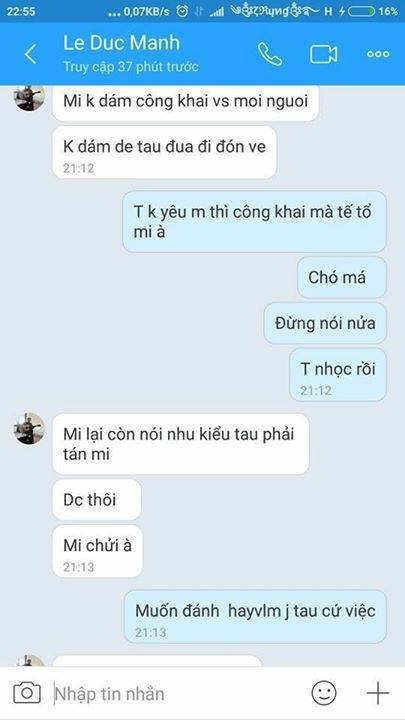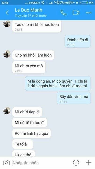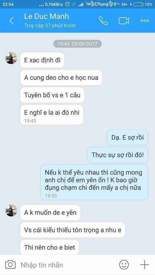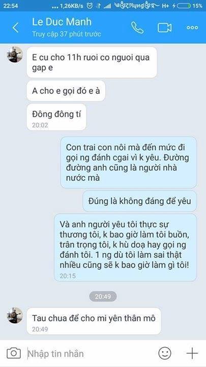 Vào khoảng 20h10 cùng ngày Đại úy Lê Đức Mạnh đến chỗ làm của em để đe doạ và lôi em ra khỏi chỗ làm để cho em gái anh ta đánh! Đồng thời anh ta ôm em, xé áo em và giữ em lại để cho em gái anh ta đánh em! Em bị chảy máu đầu rất nhiều phải đi cấp cứu! Sau khi đánh em xong anh ta còn nhắn tin hăm doạ và chửi em!