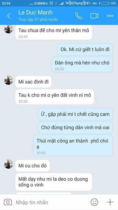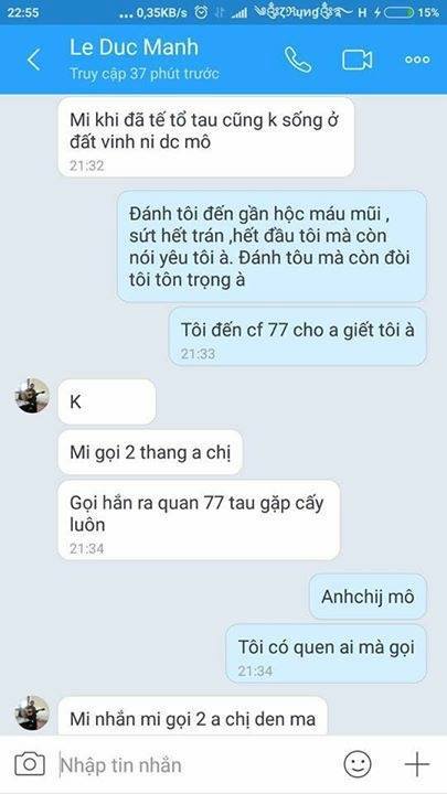 Vào hồi 20h15 phút ngày 29/9/2017 tại số 129 phố Nguyễn Văn Cừ, thành phố Vinh em bị hai người 1 nam 1 nữ đánh trong đó 1 người là Đại úy Lê Đức Mạnh sinh năm 1984 hiện đang công tác tại đội An ninh, Công an TP Vinh, tỉnh Nghệ An (có hình kèm theo) còn 1 người con gái nữa tên là Hải là em gái anh ta (có hình kèm theo)!