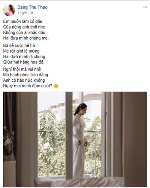 Ngày 1.10 vừa qua, Đặng Thu Thảo và bạn trai Nguyễn Trung Tín đã tổ chức đám hỏi tại nhà riêng. Trong ngày vui, Đặng Thu Thảo mặc áo dài trắng đơn giản. Ngoại hình xinh đẹp, dịu dàng, thanh tú của cô khiến cư dân mạng hết lời khen ngợi.