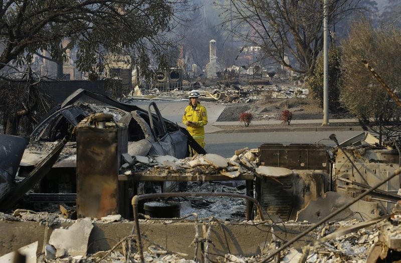 Kim Sone, nhân viên cứu hỏa, đang kiểm tra thiệt hại tại một ngôi nhà ở thành phố Santa Rosa bị cháy rừng thiêu rụi hôm 12/10. Bang California đang phải đối mặt với trận cháy rừng tồi tệ nhất trong nhiều năm qua. Ảnh: AP.