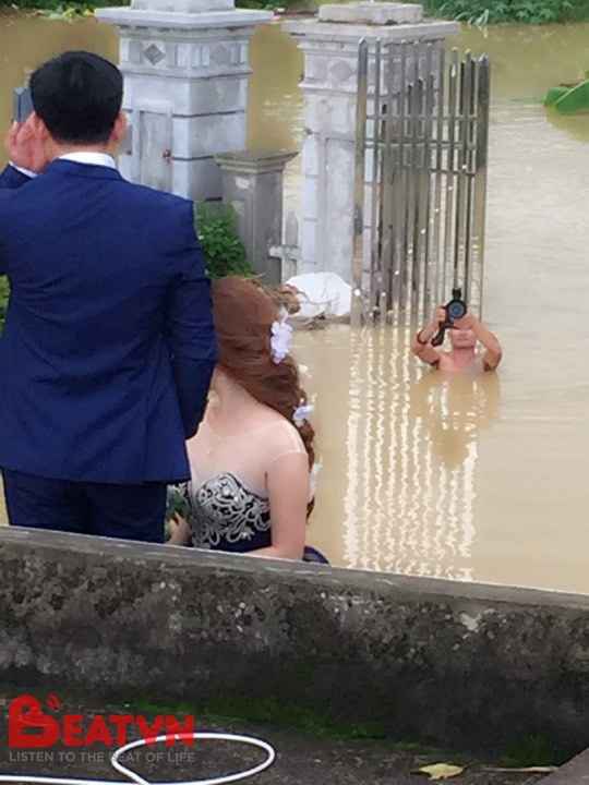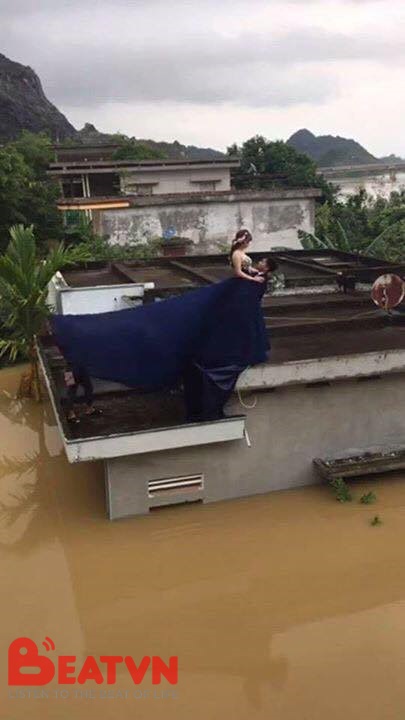 Cô dâu chú rể leo lên nóc nhà chụp ảnh cưới bất chấp lũ lụt