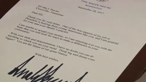 Câu chuyện đã thu hút sự chú ý sau khi tổng thống Trump viết một bức thư hồi đáp cho cậu bé hồi đầu tuần. Trong phong bì thư, ông Trump gửi kèm một bức ảnh của ông và phó tổng thống Mike Pence và 3 USD của Eli’sha Davies. Ông Trump hy vọng Davies sẽ dùng số tiền để xây dựng và cải thiện một cộng đồng tốt đẹp hơn.