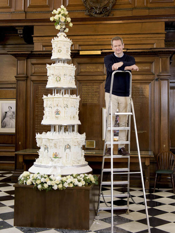 Tháp bánh nặng gần 230 kg, cao gần ba mét được làm theo h́nh mẫu bánh gốc. Tầng trên cùng sẽ được gửi tặng Nữ hoàng Elizabeth. Ba tầng c̣n lại được tặng các cựu binh tại Bệnh viện Hoàng gia Chelsea, các nhà điều dưỡng và tổ chức từ thiện khác.