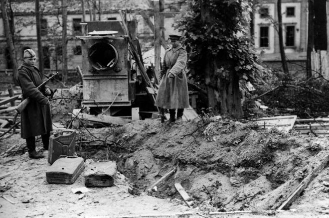 Binh sĩ Liên xô đứng cạnh nơi được cho là chôn cất trùm phát xít Hitler.
