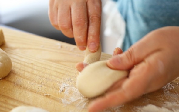10. Lập lại hành động trên với 5 cục bột còn lại. (Xem hình) Nhớ chừa khoảng cách giữa những chiếc bánh mì, vì bột sẽ tiếp tục nở ngay trên khay nướng bánh.