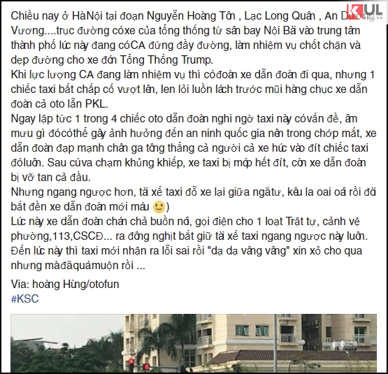 Một sự việc xảy thật quá nguy hiểm. Khi đoàn xe cảnh sát dẹp đường cho đoàn xe chở Tổng thống Doanld Trump về khách sạn tại Hà Nội thì một chiếc xe taxi bất chấp cố vượt lên, len lỏi luồn lách trước mũi hàng chục xe dẫn đoàn cả ô tô lẫn phân khối lớn.