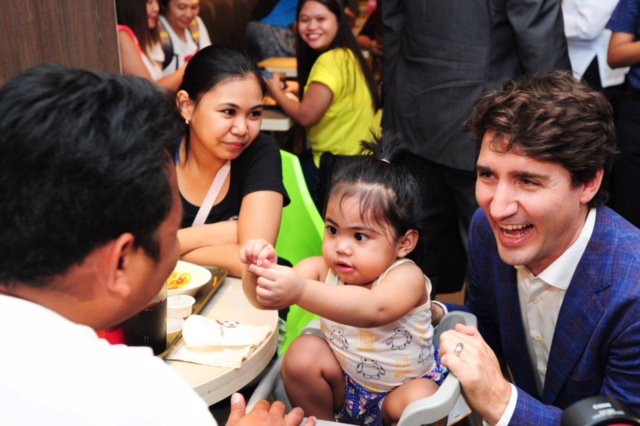 Thủ tướng Canada Justin Trudeau vui vẻ hi-fi với một vị khách nhí tại cửa hàng ăn nhanh ở Philippines - Ảnh: INQUIRER
