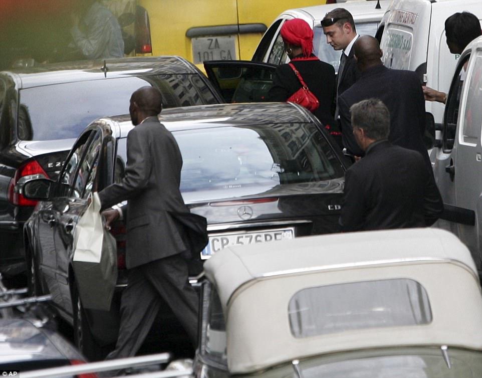 Đệ nhất phu nhân Zimbabwe đội khăn mũ đỏ cùng đoàn tuỳ tùng đi mua sắm ở châu Âu.