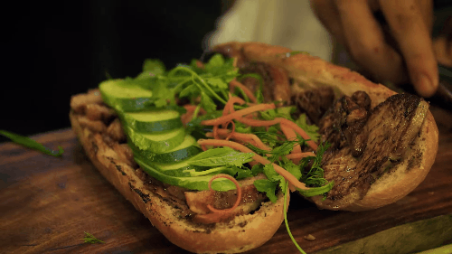 Một thành phần rẻ nhất nhưng không kém phần cầu ḱ có lẽ là phần nhân thịt sườn được căn tỷ lệ thịt - mỡ "đúng chuẩn", không quá nạc cũng không quá mỡ. Phần thịt này sẽ được đầu bếp nấu ở nhiệt độ thấp trong ṿng 6 tiếng để thịt chín thật vừa mà vẫn giữ được hương vị nguyên sơ nhất. Chưa dừng lại ở đó, trước khi cho vào bên trong chiếc bánh ḿ, phần nhân này sẽ được nướng lại cho thật thơm, thật hấp dẫn.
