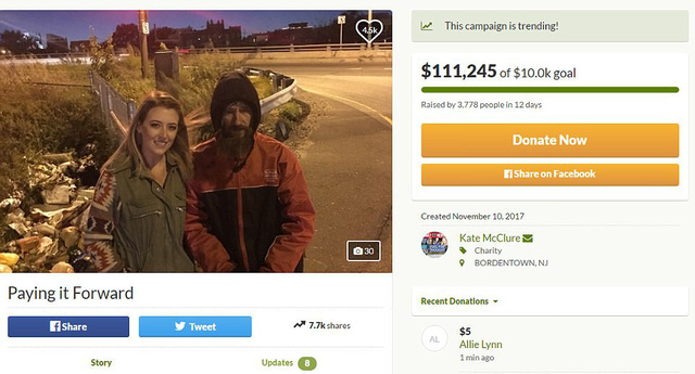 Khi một cô gái đang lái xe trên đường cao tốc hồi tháng trước thì bỗng hết xăng. Cô đã được một người vô gia cư vét 20 USD cuối cùng trong túi giúp không một chút do dự. Chỉ một tháng sau, người đàn ông này đã được cô quyên tặng hơn 110.000 USD để trả ơn.