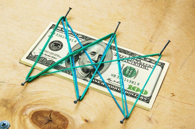 Đầu tiên, hãy lật ngược ghế lại, và đóng đinh vào đáy ghế theo hình cái hộp. Tiếp đến, uốn cong đầu đinh ra phía ngoài một chút. Tiếp đến, móc các dây cao su vào đinh như hình trên, và đẩy tiền hay tài liệu vào bên dưới.