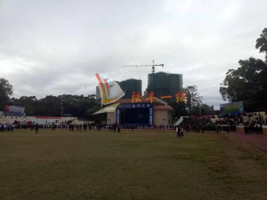Các tấm băng rôn quảng bá cho chiến dịch bài trừ ma túy trên toàn Trung Quốc được treo xung quanh sân vận động diễn ra vụ xử.