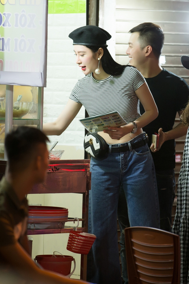 Người đẹp cho hay, cô có sở thích la cà trên phố và thưởng thức những món ngon. Phương Trinh vừa ăn chè vừa trò chuyện vui vẻ cùng bạn bè. Chiếc túi xách mà người bạn cô xách hộ có giá 3.500 USD.