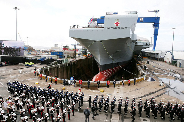 Siêu tàu sân bay HMS Prince of Wales trị giá 4,1 tỉ USD vừa được hạ thủy tại cảng Rosyth, Scotland. Đây chính là phiên bản anh em của tàu sân bay lớn nhất nước Anh HMS Queen Elizabeth.