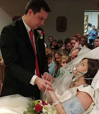 Hôm 22/12, Heather Mosher mặc váy cưới trắng, nằm trên giường, đeo mặt nạ oxy và được chú rể David Mosher trao nhẫn ngay tại bệnh viện St. Francis, thành phố Hartford, bang Connecticut. Một bức ảnh cho thấy cô đang giơ cao hai cánh tay như một biểu tượng của sự chiến thắng.
