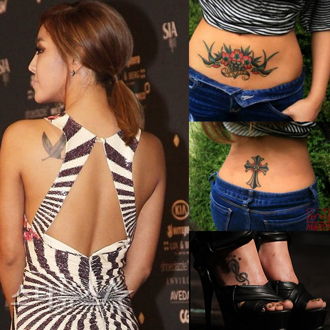 Nữ ca sĩ Narsha nhóm Brown Eyed Girls được xem là cô nàng nghiện hình xăm. Khi diện bikini, Narsha để lộ hình xăm ở giữa eo.