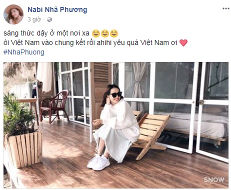 Trên trang cá nhân của mình, Nhã Phương bất ngờ đăng tải hình ảnh cô diện trang phục gam màu sáng dễ thương, nở nụ cười rạng rỡ và vô cùng quyến rũ. Theo đó, nữ diễn viên "Tuổi thanh xuân" chia sẻ, "Sáng thức dậy ở một nơi xa. Ôi Việt Nam vào chung kết rồi, ahihi, yêu quá Việt Nam ơi" với tâm trạng khá hào hứng.