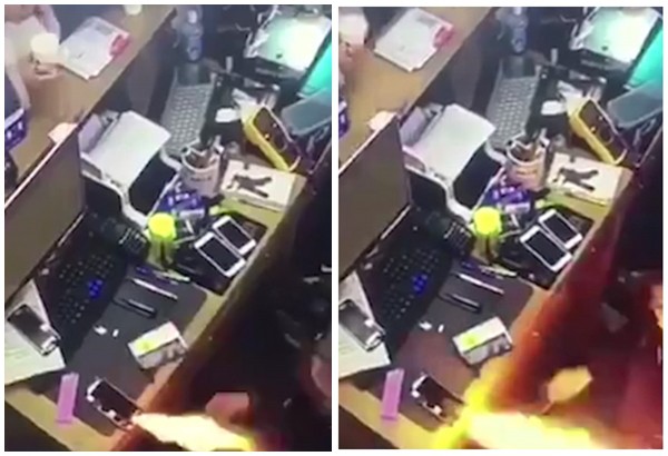 Sự việc xảy ra bên trong một cửa hàng sữa chữa thiết bị di động tại Trung Quốc và được hệ thống máy quay giám sát an ninh vô tình ghi lại được.