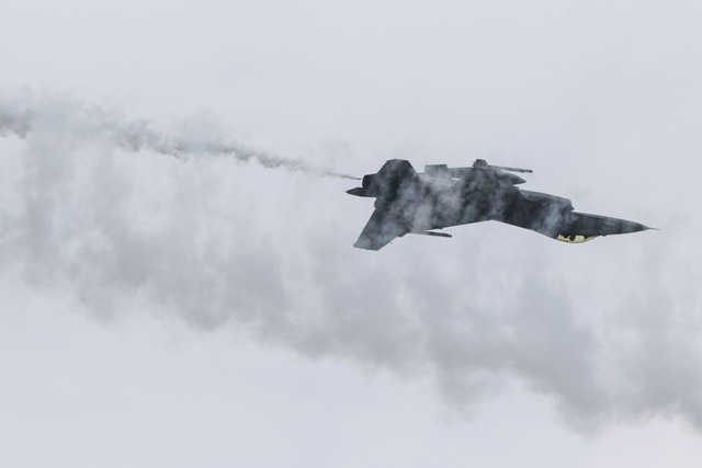 Điểm nhấn của triển lăm hàng không Singapore năm nay là các màn tŕnh diễn nhào lộn của máy bay từ 6 nước Singapore, Hàn Quốc, Indonesia, Thái Lan, Malaysia và Mỹ, trong đó có nhiều máy bay lần đầu “tŕnh làng”. Trong ảnh: Máy bay Sukhoi Su-30MKM của Không quân Hoàng gia Malaysia phô diễn sức mạnh tại Singapore. (Ảnh: Mark Cheong)