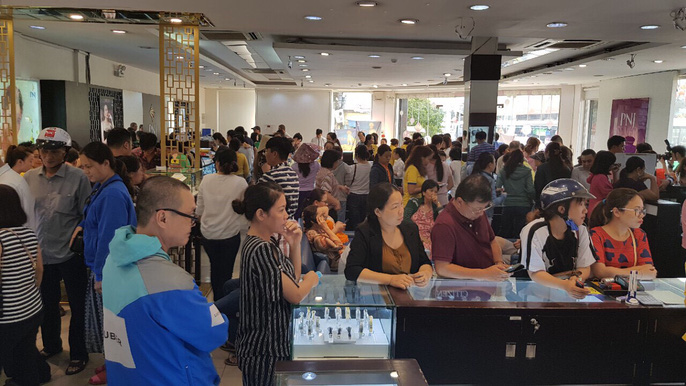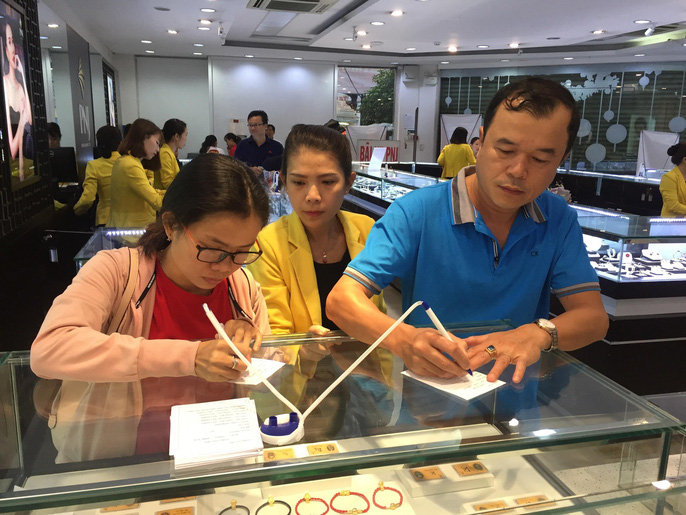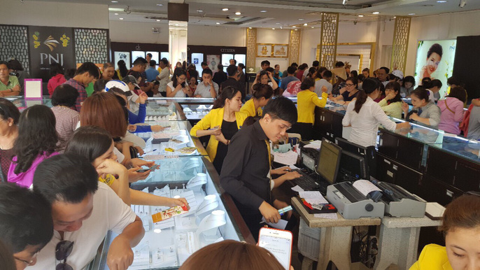 Đến khoảng 9 giờ 30, nhiều cửa hàng vàng tại TP mới đông nghẹt khách, nhiều khách hàng phải xếp hàng chờ tới lượt để mua vàng cầu may.