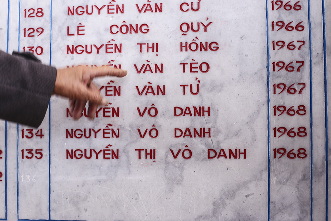 Trên tấm bia ghi danh, nhiều em bé mới được một tuổi, thậm chí chưa lọt lòng mẹ được đặt "vô danh".