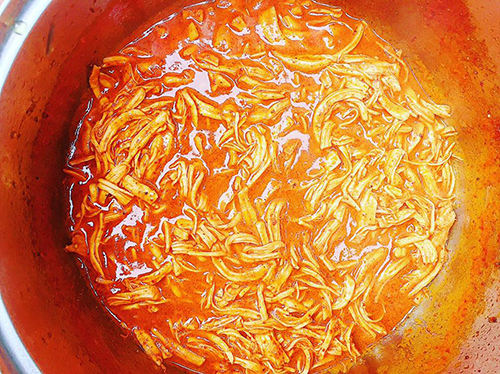 - Phần gà vừa xé nhỏ thêm 2 thìa bột điều, 1 thìa bột nghệ, 1/2 thìa ngũ vị hương, 1/2 thìa hạt tiêu, 4 thìa đường và 1 thìa hạt nêm. Đổ nước luộc gà vào vừa ngập thịt.