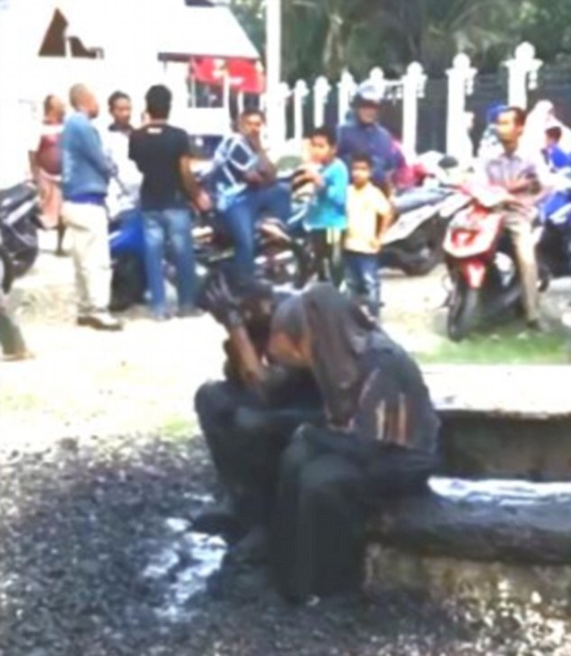 Hai người này bị đổ nước cống lên người, theo một quy tắc ghi trong đạo luật Sharia của người Hồi giáo. Vụ việc xảy ra ở làng Kayee Lee tại tỉnh Aceh, Indonesia. Trong video, một người đàn ông cầm xô nước cống đổ lên 2 người này.