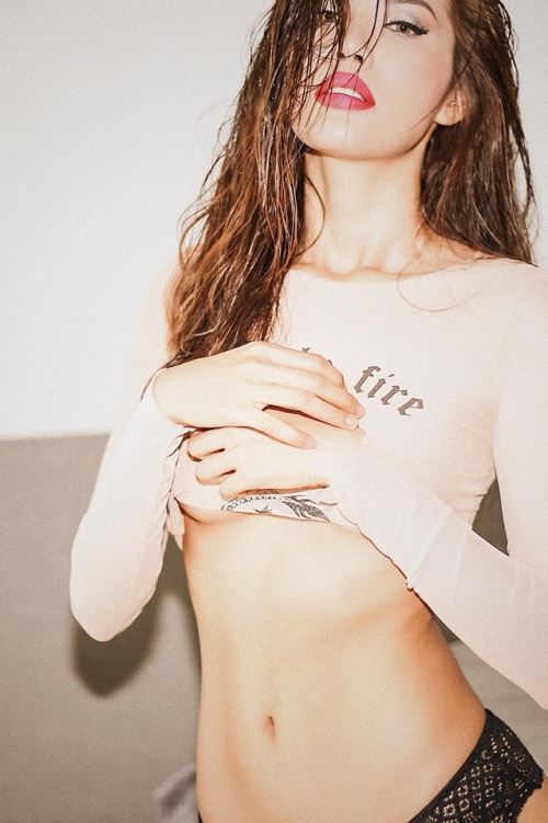 Đầu năm nay khi hàng loạt mỹ nhân Việt thay phiên nhau tung ảnh sexy nóng bỏng trên trang cá nhân. Minh tú cũng không nằm ngoài cuộc chơi, cô nhanh chóng hưởng ứng trào lưu khoe thân bằng phong cách riêng của mình. Người đẹp vén hẳn chiếc áo thun để lấp ló bầu ngực khiến dân tình được một phen “rửa mắt”.