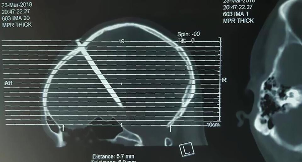 Bức ảnh được bác sỹ điều trị cho ông Thọ chụp lại cho thấy chiếc đinh đâm thẳng từ phần đỉnh đầu xuống dưới. Kết quả chụp phim cũng cho thấy những tổn thương nghiêm trọng bên trọng.