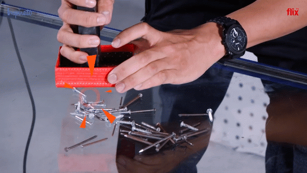 Mỗi khi dùng đinh ốc, bạn thường có thói quen đổ hết ra để lấy cho dễ. Thế nhưng đến khi dọn dẹp thì lại khá mệt khi phải nhặt từng chiếc đinh ốc. Tuy nhiên mọi chuyện sẽ được giải quyết dễ dàng với một thỏi nam châm và một cái nắp hộp hoặc một tấm bìa. Đặt nam châm phía sau tấm bìa rồi đặt cả hai gần sát xuống đống đinh ốc. Nam châm sẽ nhanh chóng hút đống đính ốc lên và giúp bạn thu gom nhanh chóng.