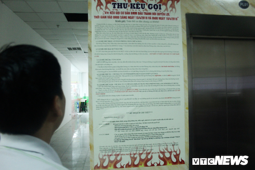Người dân dán thư kêu gọi đấu tranh v́ quyền lợi và đ̣i đảm bảo an toàn pḥng chống cháy nổ. (Ảnh: Mạnh Đoàn)