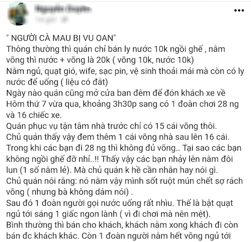 Chia sẻ với chúng tôi, bà N.T.O (66 tuổi, phường 6, TP.Cà Mau, tỉnh Cà Mau), chủ quán cafe bị nhóm phượt đăng bài “bóc phốt”, cho hay: “Sau khi nhóm bạn đó nằm võng ngủ đến sáng và kêu nước uống, tôi tính một ly nước 10.000 đồng; võng chỉ có 20.000 đồng/cái, mặc dù có nhiều võng các bạn nằm cả 2 người. Ban đầu là 175.000 đồng tiền nước, 360.000 đồng tiền võng, tổng cộng là 495.000 đồng. Sau đó, một số bạn khi thức dậy có gọi thêm 4 ly cà phê và một chai đậu nành. Cuối cùng tôi chỉ lấy tổng cộng 500.000 đồng”.