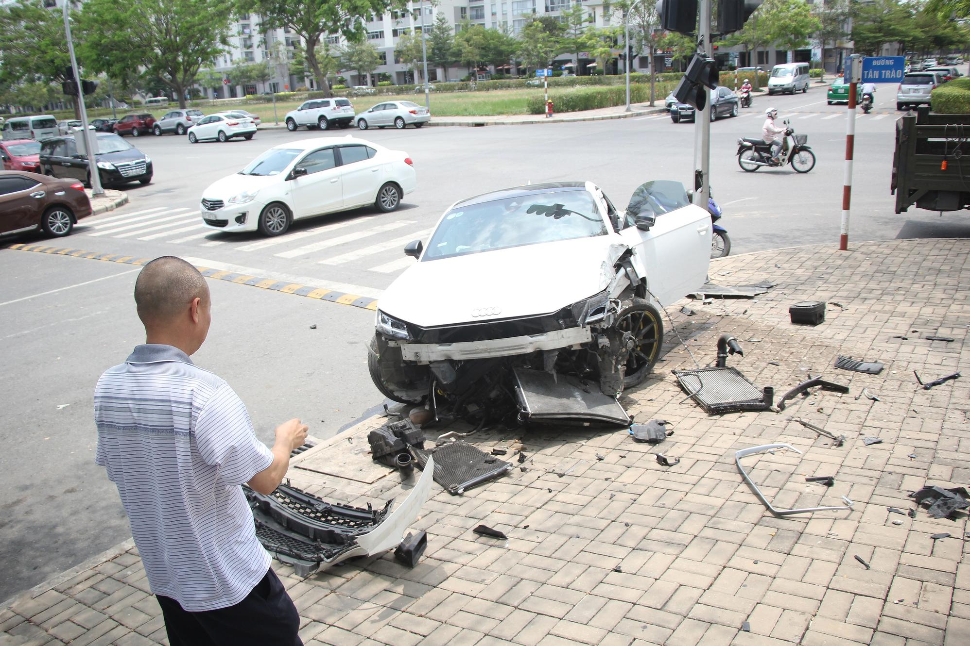 Vụ việc xảy ra vào trưa 19-4 ở giao lộ đường C thuộc phường Tân Phú, quận 7, TPHCM khiến cho chiếc xe ô tô Audi nát bươm, nhiều mảnh vỡ văng tung tóe trên vỉa hè, đèn giao thông bị ô tô tông văng xe ngoài, trụ đèn nghiêng sang một bên. Tài xế bị thương nhẹ thoát chết.