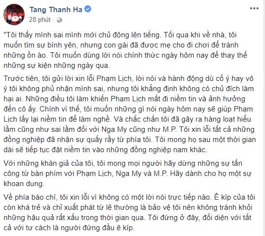 Tăng Thanh Hà, bạn thân của vợ Phạm Anh Khoa đã đưa lại lời xin lỗi của anh trên trang cá nhân và viết: ""TM đã thật sự lớn rồi... Thương Sẻ Lớn, yêu Cào Cào, Châu Chấu của cô Sẻ!".