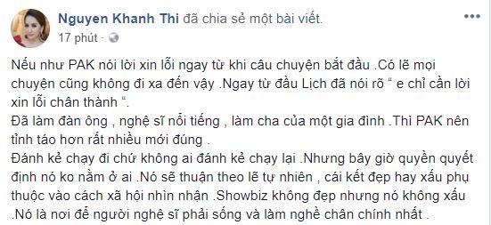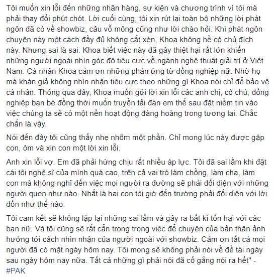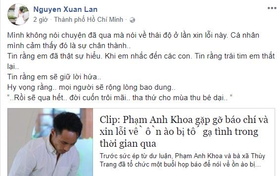 Ngoài ra, tôi cũng gửi lời xin lỗi đến gia đình của Anh Khoa vì những lùm xùm này. Nhất là chị Mây, vợ anh Khoa. Đến thời điểm này, tôi vẫn rất trân trọng chị"