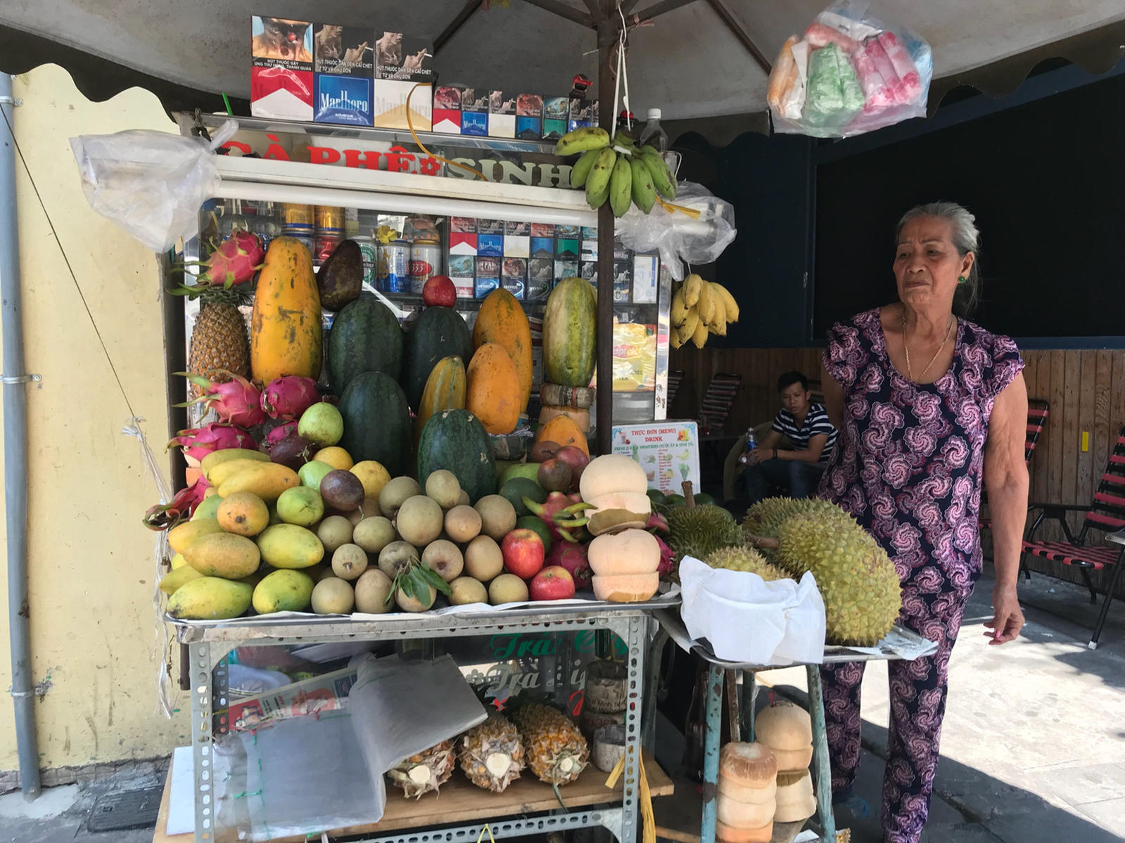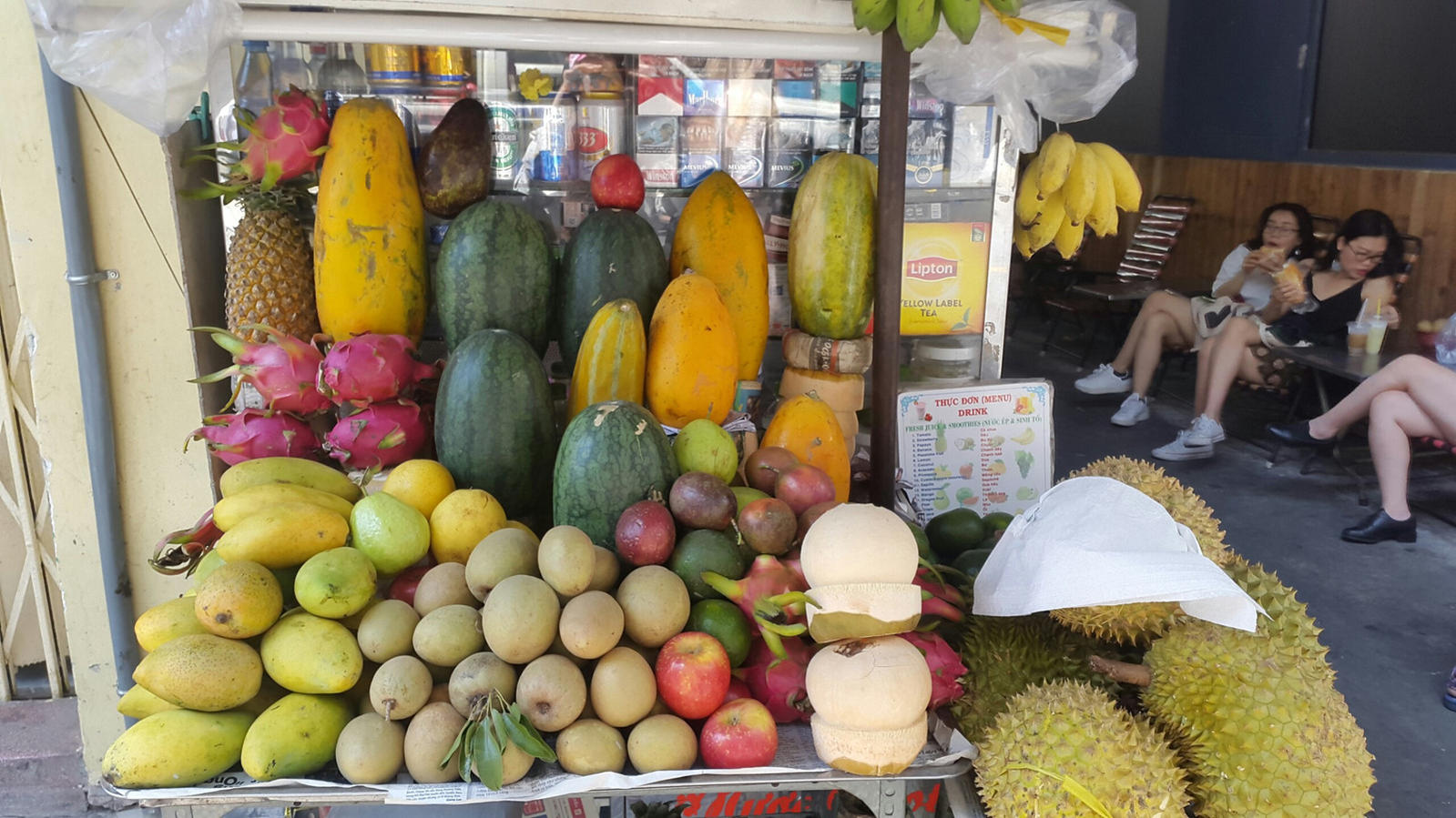 Có lẽ khách quốc tế đều chết mê chết mệt xe sinh tố của bà Linh. Các loại trái cây ở đây đủ các màu sắc. Xe sinh tố này có hàng chục năm tuổi ở phố đi bộ Bùi Viện.