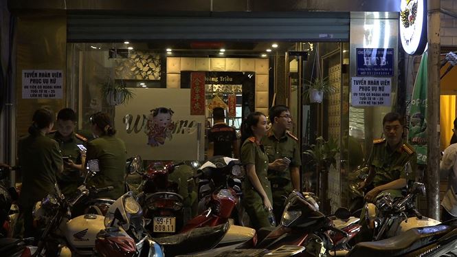 Tối 1/6, Pḥng cảnh sát quản lư hành chính về trật tự xă hội (PC64), công an TPHCM tổ chức kiểm tra các cơ sở kinh doanh dịch vụ nhạy cảm, dễ phát sinh tiêu cực trên địa bàn quận 1.